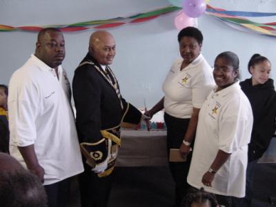 PM Michael Parker, Grand Master Wilbert M. Curtis, Grand Worthy Matron Martha Woolridge and PM Devenus Parker cutting the cake