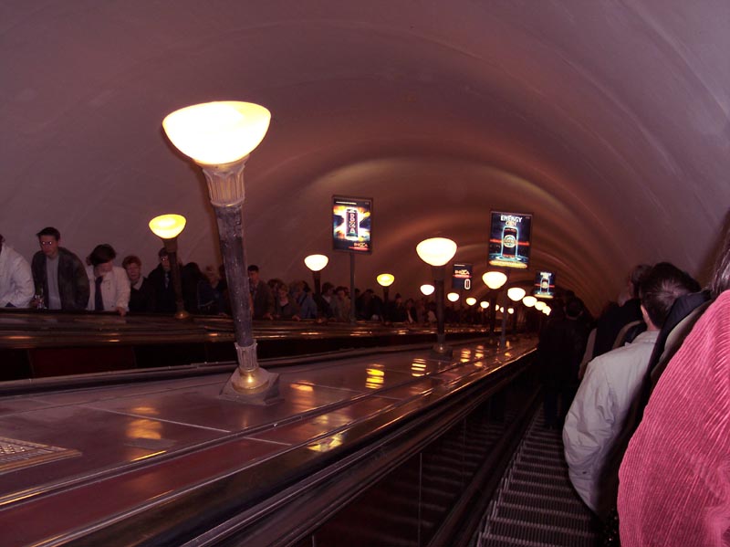 The Petersburg Metro is very deep, because it must run underneath the Neva River and swampy land. The escalator ride takes about five minutes. Photo by Stephanie Carrie. | |