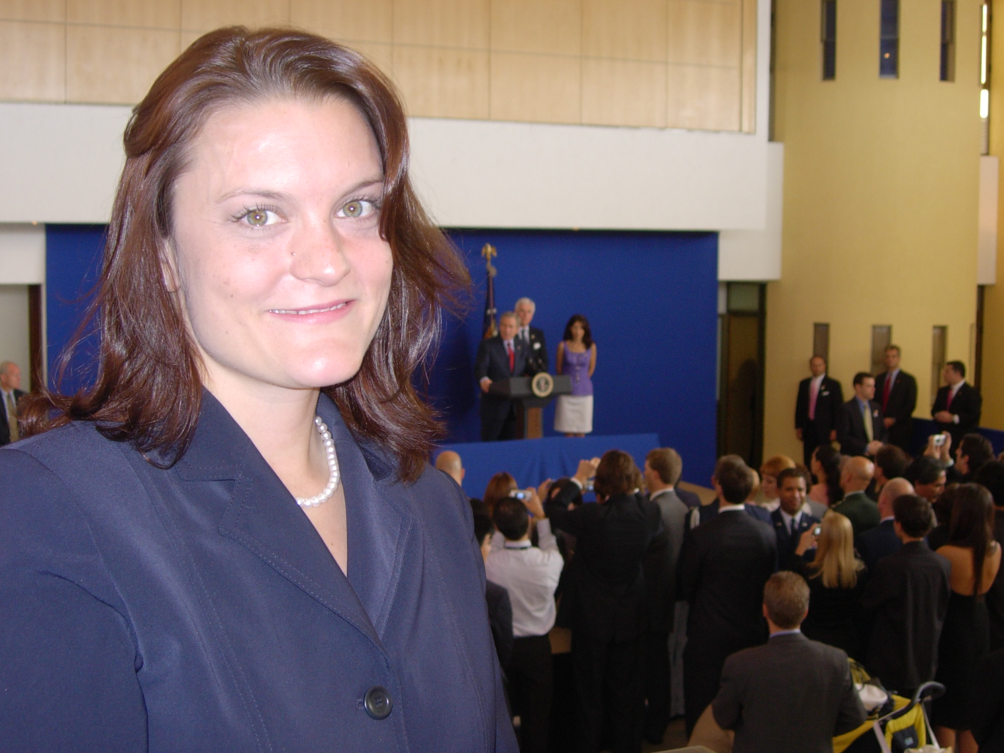 My sister, the jet-setter. Who's that chimp-like man in the background behind the microphone?