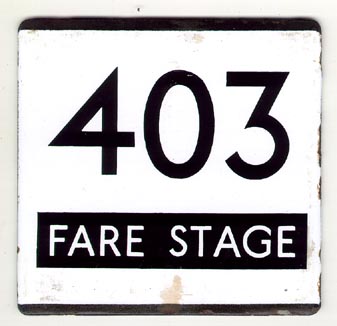 Route 403 began running on 16 August 1921 as London General Country Services’ route S3 between West Croydon and Sevenoaks via South Croydon, Sanderstead, Hamsey Green, Warlingham, Chelsham, Botley Hill, Tatsfield, Westerham, Brasted, Sundridge and Riverhead. The S3 was renumbered 403 on 1 December 1924 as part of the Bassom scheme. In 1935 the purchase of Redcar from Maidstone & District extended the 403 on 31 July from Sevenoaks to Tonbridge Station via Hildenborough. On 2 September 1936 it was extended westward via Waddon and Beddington to Wallington Station. On 3 July 1971 the 403 was withdrawn beyond Chelsham, the through service from West Croydon to Sevenoaks being renumbered 403A. Both routes were also converted to one-man-operation at the same time. A more detailed history of route 403 and its branches can be found in Kenneth Warren’s book, The Motorbus in London Country (Ian Allan, 1984; ISBN 0 7110 1360 8). I don’t have any information about express journeys on the 409, but they likely predate the London Country era when the route was cut back to only run as far as Chelsham. Judging by the irregularities in the figures, this “E” plate may have been hand lettered. |