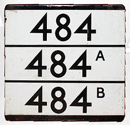 Route 484A ran between Dachet and Slough (The George) via Langley, Slough and Salt Hill. The first plate is one of the very early post-war ones without the black line at the top and bottom. These plates were fitted into the older flat bus stop flags which also had horizontal cross bars and thus the top and bottom edges were hidden. However, they required a great deal of dismantling to change and hence the modern style was devised with the black top and bottom edging and which could simply be dropped into the runners. Note also that the loops of the “8” are circular rather than teardrop shaped, which is also characteristic of old plates. “ALIGHTING POINT ONLY” plates are used either ator the stop beforea bus terminus where passengers should not board buses. The second “E” plate likely came from a stop in Farnham Road. |