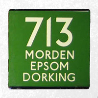 Route 713 was introduced in 1946 as part of the post-war re-instatement of the coach services. It ran between Dorking and Dunstable via Leatherhead, Epsom, North Cheam, Morden, Victoria, Hendon, Borehamwood and St. Albans. From the mid-1960s some journeys diverted at St. Albans to Luton. Operated throughout most of the 1950s and all of the 1960s by the famous RF-class coaches, conversion to one-person operation came in 1969. The Green Line network began to be run down in the 1970s, and 713 journeys north of St. Albans and south of Victoria were withdrawn in 1975, the latter being replaced by new route 703. The remaining route was withdrawn in 1977 with replacement by new routes 707 and 717. | ||