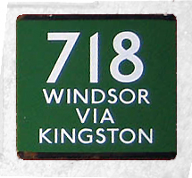 Route 718 was established after the War commencing in April 1946, and ran between Windsor and Epping via Slough, London Airport, Chelsea, Victoria, Baker Street, Camden Town, Finsbury Park, Walthamstow, Chingford and Buckhurst Hill. It replaced the pre-War service G in the west and N in the northeast. By 1958 it had been extended to Harlow (New Town). At the transfer of Green Line services from London Transport to London Country, it was using RMC-class short Routemaster coahces out of Harlow [HA] and Windsor [WR] garages. Both of these “E” plates are from westbound stops. The use of the word “VIA” on a plate with white lettering is unusual. |