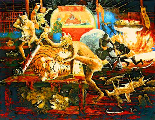 "Por último de tudo, considerai o tremendo tormento daquelas almas condenadas, as que tentaram e as que foram tentadas, agora juntas, e ainda por cima, na companhia dos demônios. Esses demônios afligirão os danados de duas maneiras: com a sua presença e com as suas admoestações. Não podemos ter uma idéia de quão terríveis são esses demônios. Santa Catarina de Siena uma vez viu um demônio e escreveu que preferia caminhar até o fim de sua vida por um caminho de carvões em brasa a ter que olhar de novo um único instante para tão horroroso monstro. Tais demônios, que outrora foram formosos anjos, tornaram-se tão repelentes e feios quanto antes tinham de lindos. Escarnecem e riem das almas perdidas que arrastaram para a ruína. É com eles que são feitas, no inferno, as vozes da consciência. Por que pecaste? Por que deste ouvido às tentações dos amigos? Por que abandonaste tuas práticas piedosas e tuas boas ações? Por que não evitaste as ocasiões de pecado? Por que não deixaste aquele mau companheiro?
