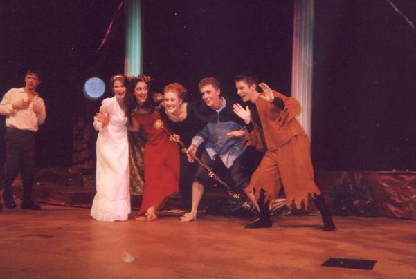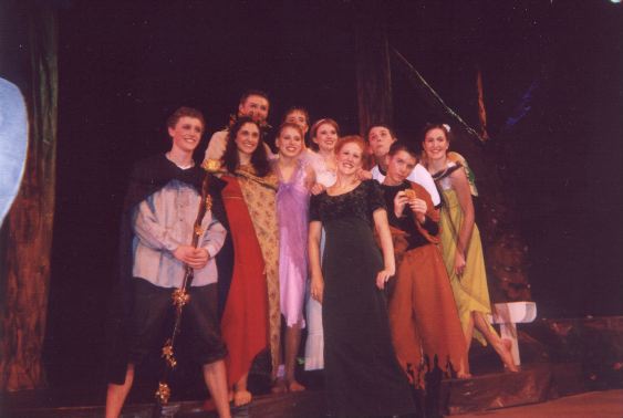I designed and built the set. I did not build the outside trees. I did make the inside trees(rotate them 180degrees then they're)pillars. Notice how nice the lights are. My brother just graduated in ... theatre... so he did our lights for us. They were not completed however; a drunk driver hit him and his girlfriend head on a couple of nights before the performance. So he did not finish the lights. No one noticed, they still rocked.