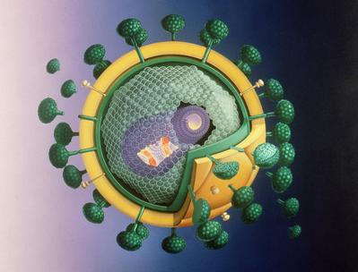 HIV, the virus that causes AIDS, is shown budding out of a human