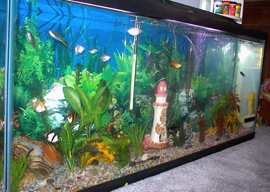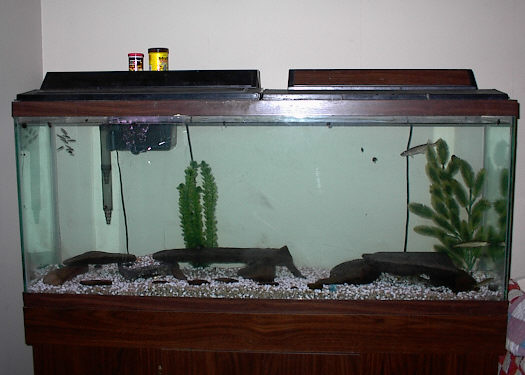55 gallons; currently contains 2 pictus cats, a spotted and striped raphael cat, 5 tiger barbs, 4 colored skirted tetras, 2 irradescent sharks, 1 silver tipped shark, 1 platy, 2 swordtails, 3 cories, 1 banjo cat, 1 mugondi gobi, 1 knight gobi, 1 kisser, 1 flame dwarf gourami, and 1 pleco.