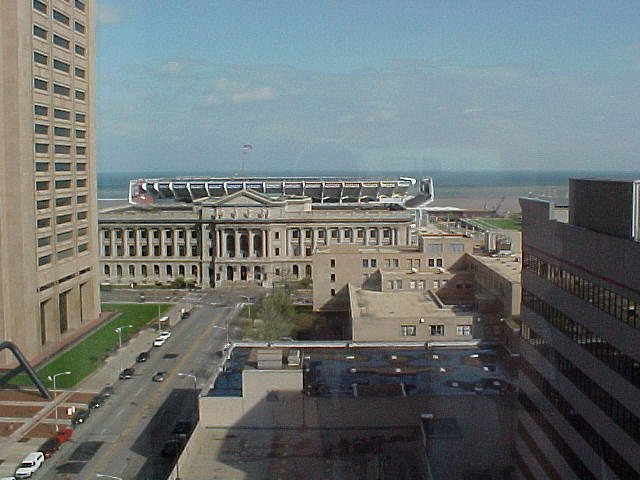 The view outside the Marriott window... Cleveland Indian's Stadium and Lake Erie.
