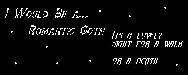 I Will Take my own life!.After going through with your own well thought out version of columbine you finally turn the gun on yourself... the thick coat of brains and coagulated blood was a bitch to get off the auditorium wall. You sure showed them!(you have 4 months and 7 days to live, from the date you read this) Find out how you will die, Take the Death Quiz now! What kind of ANGEL are you? Quiz made by Angela ![]() take the antisocial test. and go to mewing.net. because laura's feeling social. ![]() take the virgin-whore dichotomy quiz. and go to mewing.net. where we're all studs. ![]() do YOU smell? mewing.net. a wide field of wild daisies. ![]() take the nerd test. and go to mewing.net. a nerd utopia. ![]() blue chucks what color chucks are you? brought to you by Quizilla ![]() you are a fantasy book what type of book are you? brought to you by Quizilla ![]() What day are you? Monday's Child is fair of face Tuesday Child is full of grace Wednesday's Child is full of woe Thursday's Child has far to go Friday's Child is loving and giving Saturday's Child works hard for a living But Sunday's Child is fair and wise, and good and gay ![]() Lucifer. The most misunderstood of all the ArchAngels, you're most like the ArchAngel of Light. You've seen the darkside and have opted for something better. You need better press, though chances are no one will really understand your motives. Which ArchAngel are you most like? brought to you by Quizilla Lucifer. The most misunderstood of all the ArchAngels, you're most like the ArchAngel of Light. You've seen the darkside and have opted for something better. You need better press, though chances are no one will really understand your motives. ![]() Emotional Wreck. You are extremely emotional. You feel contentment moreso than happiness and your emotional lows are to the extreme. You need to cheer up and start enjoying your life. Where there is rain there is a rainbow and you need to see it more than others. Do something that makes you happy. How Emotional Are You? brought to you by Quizilla ![]() Congratulations, you're a Pillywiggin, a trouping flower fae. What kind of female faerie are you? Take the female faerie quizby Paradox. Pillywiggins Pillywiggins are seasonal faeries from England and Wales that are associated with Spring and closely related to Pixies. They are also known as Spring Faeries and Flower Faeries. They live among wildflowers which grow at the feet of huge oaks. They mimick human behaviour, but will not prank. They love to ride bees from flower to flower. ![]() take the "what's my fault" quiz. (and then browse around mewing.net. because laura is cool.) ![]() ![]() You're a Velvety-Mopey-Goth! You're wardrobe isn't condusive to heat, water, or the natural range of human movement. People may think you're cheesy, but you know it's just because their infantile minds can't fully comprehend the insurmountable anguish of your existence. What kind of Goth would you be? brought to you by Quizilla