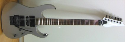 As I've explained this is a limited edition model. I have always wanted a guitar with a tremolo that is capable of crazy whammy techniques, so I chose this cool looking guitar. It has a Lo-Pro Edge trem, in later models, it is replaced by a bulkier Edge Trem (which I don't like as much). The colour of this guitar looks really futuristic and cool. So what is this colour? Well, Ibanez calls it CPK, which stands for cyber pink!! Um, not a hint of pink anywhere! More like flat silver! Oh well, it looks cool, so there. It has a basswood body and an upgraded neck. Yep, this isn't any normal Ibanez Super Wizard neck. This Super Wizard neck has clear shark tooth inlays with pearl bindings all around the finger board! The best part of this neck is that it is made by two different woods instead of just a normal maple neck. It is a 3-ply maple/bubinga/maple neck with a rosewood fingerboard. I placed a chrome pick holder on the bottom horn. This guitar sounds good and looks awesome.