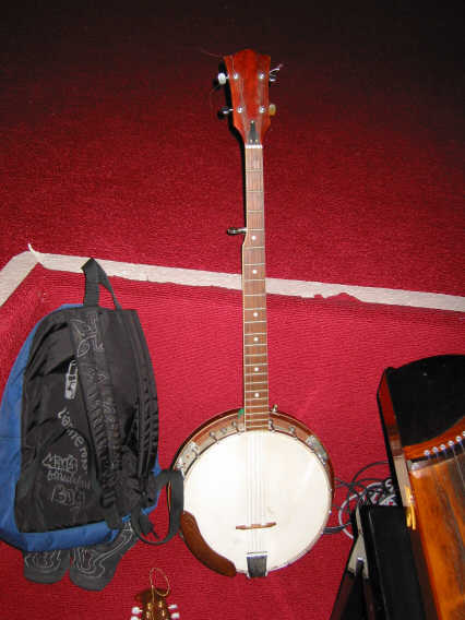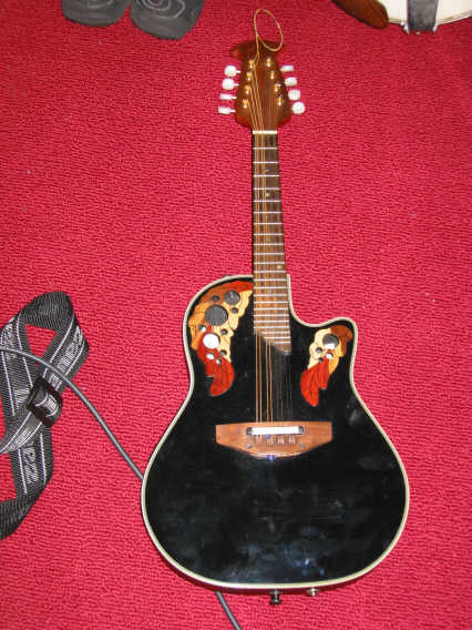 The very traditional looking mandolin. It can be plugged in too, but then you don't get that acoustic sound, so I use it unplugged. Killed my fingers playing that!