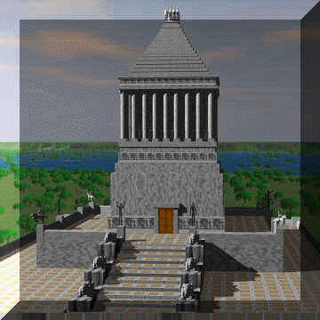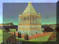 beauty of the tomb rather than its size that fascinated its visitors for years. When the Persians expanded their ancient kingdom to include Mesopotamia, Northern India, Syria, Egypt, and Asia Minor, the king could not control his vast empire without the help of local governors or rulers -- the Satraps. The kingdom of Caria in the western part of Asia Minor (Turkey) was so far from the Persian capital that it was practically autonomous. From 377 to 353 BC, king Mausollos of Caria reigned and moved his capital to Halicarnassus. The construction of his tomb was conceived by his wife and sister Artemisia, and the work of the tomb might have started during the king's lifetime. The Mausoleum was completed around 350 BC, three years after Mausollos death, and one year after Artemisia's. The structure was rectangular in plan, with base dimensions of about 40 m (120 ft) by 30 m (100 ft). Overlying the foundation was a stepped podium the sides of which were decorated with statues. The burial chamber and the sarcophagus of white alabaster decorated with gold were located on the podium and surrounded by Ionic columns. The colonnade supported a pyramid roof which was in turn decorated with statues. A statue of a chariot pulled by four horses adorned the top of the tomb. For 16 centuries, the Mausoleum remained in good condition until an earthquake caused some damage to the roof and colonnade. In the early fifteenth century, the Knights of St. John of Malta invaded the region and built a massive crusader castle. When they decided to fortify it in 1494, they used the stones of the Mausoleum. By 1522, almost every block of the Mausoleum had been disassembled and used for construction. Today, the massive castle still stands in Bodrum, and the polished stone and marble blocks of the Mausoleum can be spotted within the walls of the structure. Some of the sculptures survived and are today on display at the British Museum in London . These include fragments of statues and many slabs of the frieze showing the battle between the Greeks and the Amazons. At the site of the Mausoleum itself, only the foundation remains of the once magnificent Wonder. The beauty of the Mausoleum is not only in the structure itself, but in the decorations and statues that adorned the outside at different levels on the podium and the roof. There were statues of people, lions, horses, and other animals. The statues were carved by four Greek sculptors: Bryaxis, Leochares, Scopas, and Timotheus, each responsible for one side. Because the statues were of people and animals, the Mausoleum holds a special place in history. It was not dedicated to the gods of Ancient Greece. Since the nineteenth century, archeological excavations have been undertaken at the Mausoleum site. These excavations together with detailed descriptions by ancient historians give us a fairly good idea about the shape and appearance of the Mausoleum. A modern reconstruction of the shorter side of the Mausoleum illustrates the lavish nature of the art and architecture of the building. |