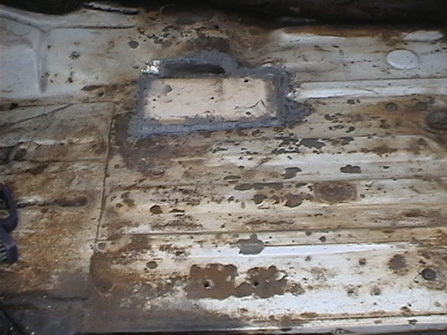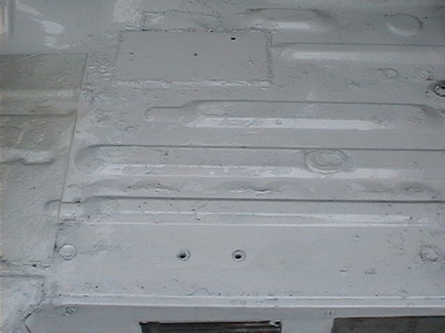 Grinded and wire brushed passenger side floor of cab to check for soundness, everywhere else ok, so plated then seam sealed where the split was.
