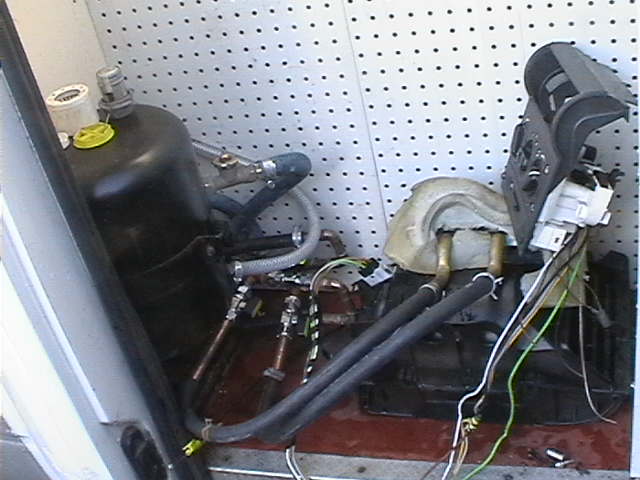 Done lots of stuff you can't see...new cambelt, oil, fan belt, power steering belt,oil air and fuel filters, some new hoses and clips, new second battery..................... started on plumbing in my partially built "back of house" or garage, having now got the eberspacher running right, i am using vauxhall heater matrix for the rear heating, i was going to use the fresh air or recirculated air option fron the air box, but have changed my mind as the fresh air inlet could possibly suck fumes from the eberspacher in certain circumstances, i am also working on putting a water tank above the calorifier that would automatiacally top it up, i may have a go at fabricating a grp tank myself.