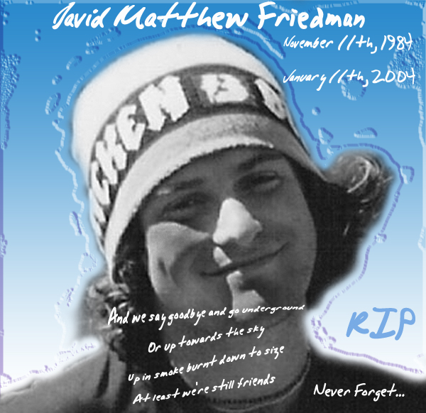 David Matthew Friedman left us Sunday January 11th, 2004 at 12:58 am. He was driving his father's BMW M5 and was involved in a tragic car accident. Dave was the best friend anyone could ever ask for. He leaves behind many memories and countless friends who love him and miss him dearly. He will never be forgotten and he lives on in our memories. |