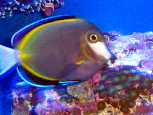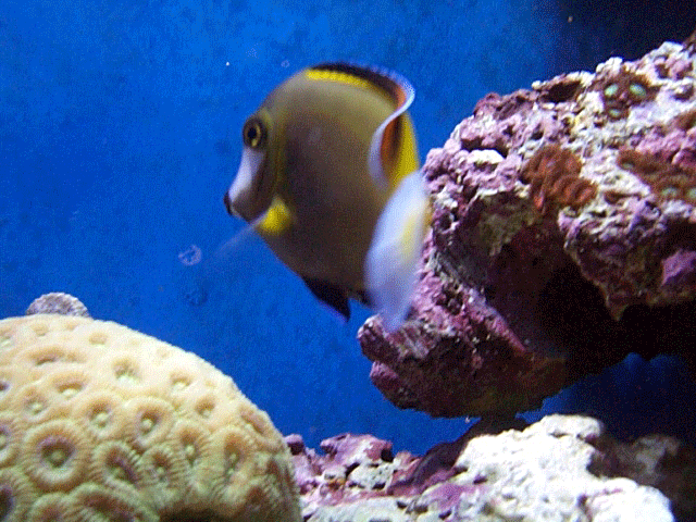 Here is our Powder Brown Tang. Acanthurus Japonicus is the Latin Name. He is always on the move, so its hard to get a descent picture of him. You can see the female clown in the back poking her head out to see what's going on. The fins on the Tang have a brilliant glow to them due to the Actinic Fluorescents.