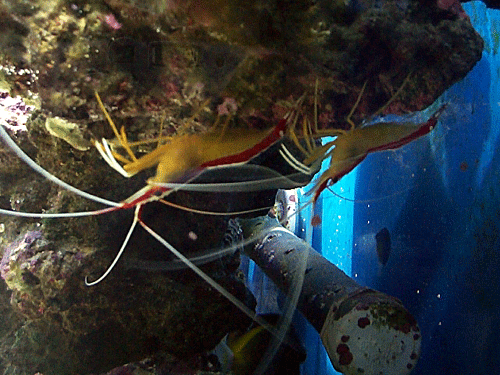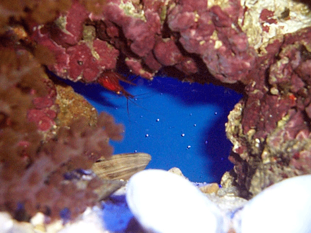 These two are the most interactive thing critters we have. When ever we open the hood they will swim up to the surface to greet us. If we put our hands in the water they will climb right in and clean off any dead skin or dirt. Hence the name, "Cleaner Shrimp," Lysmata amboinensis. The one in the front is the female, she's actually carrying eggs here, but its hard to tell. This is their shop, and they are open for business. Any fish with an itch swims here and the cleaners go to work, no charge.