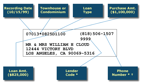 Why use new homeowner mailing lists? Do you remember the last time you moved? Do you remember how you had to look around to find all of those businesses that offered the things you needed such as a plumber, a grocery market, an interior designer, a church, a home-supply warehouse, or a home appliance store? With our mail and phone lists, you can reach out and be the first one to make contact with those new homeowners who need your business now more than ever. What are the benefits of using new homeowner mailing lists? Mailing lists provide information about the location of new homeowners, who are credit rich and spend more in the first 90 days of moving in than they do after. The new homeowners are anxious to find new businesses and professionals in their community who can serve their needs. Our mailing lists are the only way to target your mailing and telemarketing to gain these new customers. How fast does your company offer new homeowners' names and addresses? In most metropolitan areas, we offer lists of new homeowners' names and addresses up to 3 weeks faster than other competing list companies. Through extensive use of the Internet, e-mail, and fax, we fulfill our aim to provide the fastest, most up-to-date lists in the industry. How effective are mailing lists in helping businesses bring in more customers? Over 3,000 businesses use our mailing lists every week (monthly in some locations) and over 1,000 businesses that use us as their main source of clients outside of networking, referrals, and old customers. Some businesses have used our lists for as long as 23 years! What other services do you offer besides new homeowner mailing lists? Though mailing lists are our core business, we also offer new homeowner phone lists, a free "Guide to Success" brochure for new or small businesses to help them complete a direct mail program, and free consultation for those who are having trouble with their mailing pieces. We offer stockbroker and mortgage lead services as well. Click here to get more information. What kind of clients use your lists? Our clients range from small individual-run businesses to larger corporations throughout the United States. I have one of your new homeowner mailing list labels, but I don't know what the lines of numbers mean. Can you help? See the diagram below: |