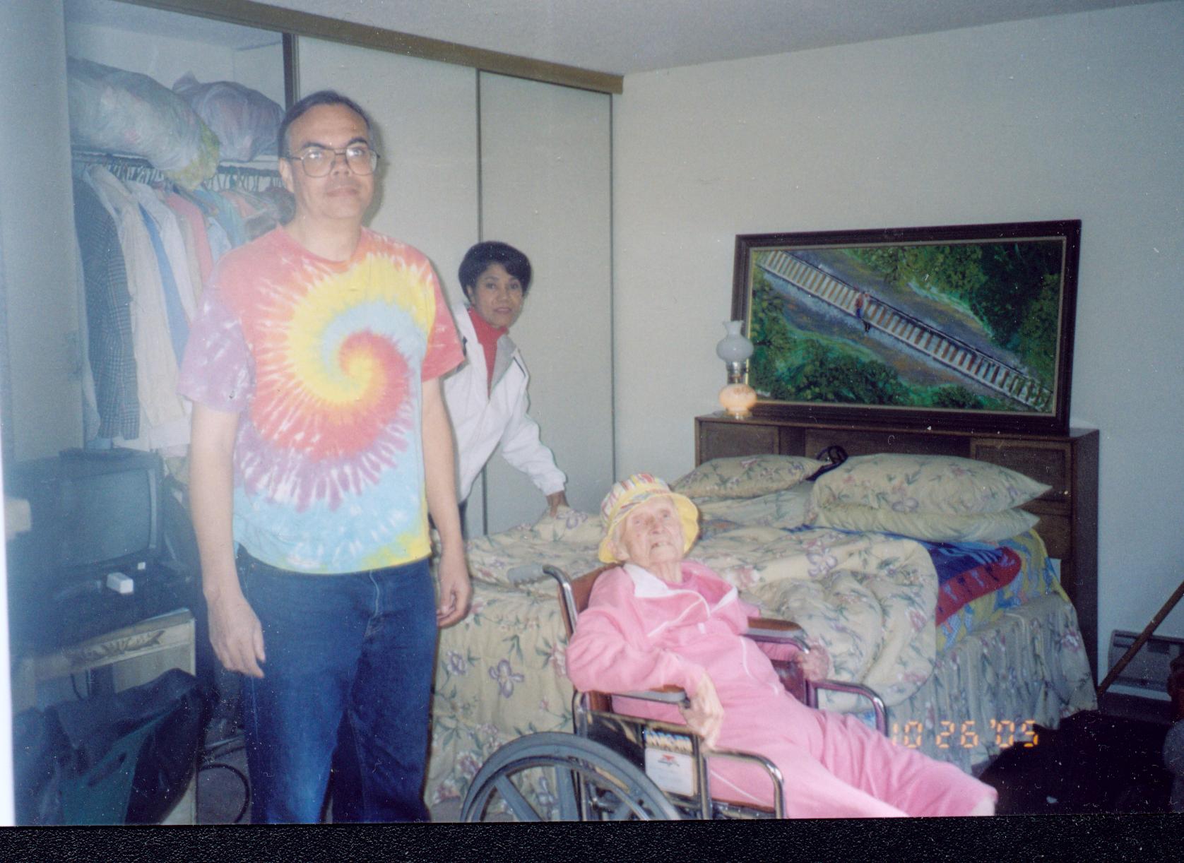 | 05-2-25b This is the last picture of Hazel, taken on Wednesday, October 26, 2005 in her bedroom at Leisure World. Sunilda Ledentu, Dean Richard Toby and Hazel had just returned from getting her at the nursing home. We brought her back in the RV, because that was easy for her to get into and out of. After we got her in the house, we washed her up and put her in bed. She slept soundly from 5:00 pm until about 3:00 am the next morning. Then she woke up and said, “What now.” Toby went in. She wanted to hold hands, as was often the case in the past year. She did not want to get out of bed to go to the toilet or to get something to eat. She dozed off. Toward 10:00 am, Toby and Dean got her up and took her to the toilet. Afterwards, as they were putting her in the wheelchair, she went limp. It turned out her heart had given out. The rescue squad came and took her to the hospital, but they could not get her heart going again. She had had one last night in her own room and she had liked it. Click here to view the obituary of Hazel that appeared in the Washington Post. | |