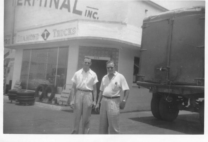 | 18.7 Adjer Hogan (left) about 1960 in front of Diamond Trucks in Jacksonville, Florida. He managed it for 35 years. In the front are some of the tires and oil which he sold. | |