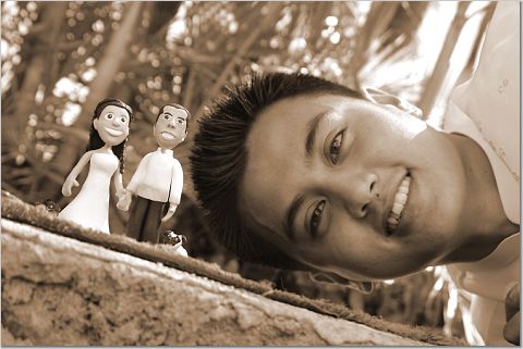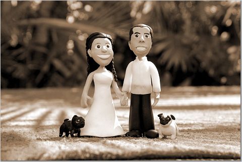I finally got some pictures to show you! Click on the picture to see a zoomed in view. This is the cake topper that I made for Janis and Mikee. The topper that I was so stressed out about. It turned out better than I had expected, and people at the wedding seemed to like it. Here's a closer pic: Now that it's all done, I seem to have forgotten how much of a pain-in-the-ass it was to make. I want to make some more stuff, but I need to find something else to make. I'll eventually try to make Me and Grace, but maybe later on...