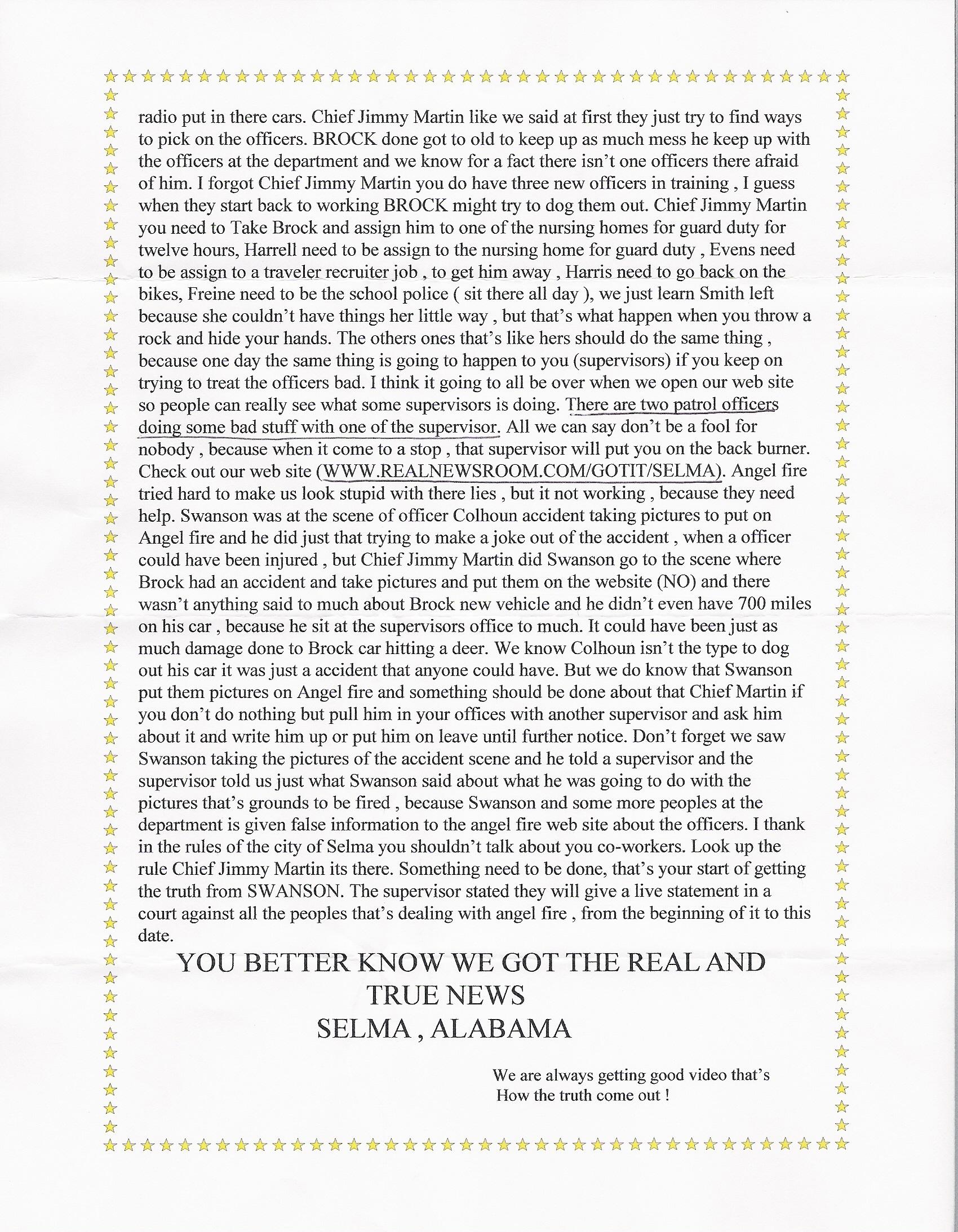 Our source in the SPD has sent us another letter from the incompetents who work forthe SPD. Although the letter is critical of this website, we are printing it to show the kind of people who work at the SPD. No wonder crime is out of control in Selma!!