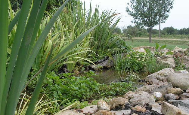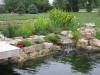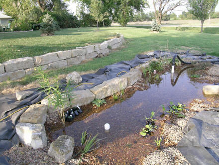 The water is pumped from the pond skimmer into the bottom of the gravel-filled bog. We researched this type of filter by googling "bog" & "veggies filters". We knew we wanted it to look as natural as possible with no liner or hoses, etc. showing when completely finished, so this design seemed like a good option. To clean out the matrix of pipes, we hook another hose to the "clean-out" pipe, turn the pump back on and let the sludge flow out away from the pond. After the standard 6 to 8 weeks of green water while the filter matured, the water cleared and has remained that way. September 2006...