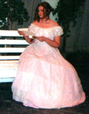 One of the few times you wll ever see Crys Kelly in pink. This is a civil war costume I modeled for a theatre project. My character name was Jenayda Tollinscraft. Taken about March, 2000.