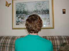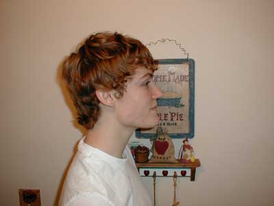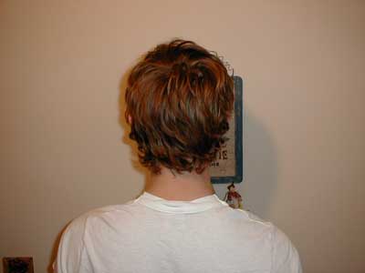 This is a wallet sized photo taken for my senior pictures. This picture is really too small too see much, but the picture below is much bigger. Senior Picture #2 (Picture not shown here because of it's awkward size and appeareance) I shouldn't really say I consciously decided to let my hair grow longer at this point. Actually, after I dyed it back brown before I cut it is when I realized that I wanted longer hair. But, I knew that it would be better to cut off the bleached and dyed parts before it got too long. I didn't want dried out frizzy hair when it was only a half foot long. So, this is one of my senior takes with me looking like a short haired geek. Beginning of monthly hair growth progress below... December, 2002