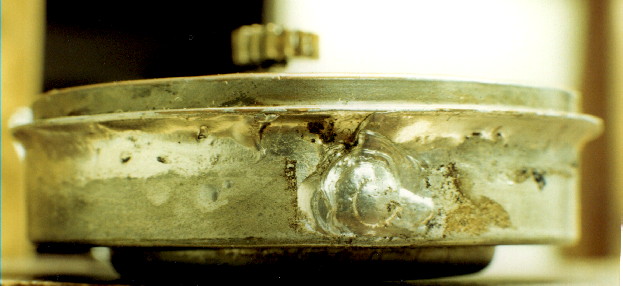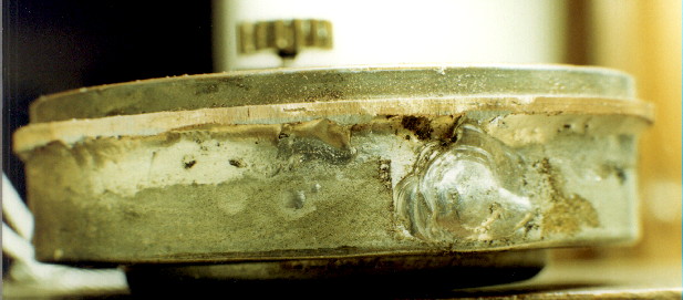 I was given one of these clocks and, since it did not run, I took the motor apart because I had nothing to lose. The best way to do this is to place the outermost edge against a stone grinding wheel, all the way around, removing about 1 mm. of circumference (see photos below), and pry it apart with a screwdriver. One side of the case has an extra quantity of solder which covers up a lubrication hole: pry open from the other side. The two brass plates inside are riveted together: grind off the rivets, of which there are four, and pry off the back plate. If you grind off just enough rivet to remove the plate, it would go on friction tight afterwards and this would not come apart by itself. The only thing that seems to go wrong with this motor is that the rotor is relatively heavy and this weight wears out the brass hole until the rotor rubs on the frame just next to it, stopping the clock. To remove the rotor, it is necessary to remove the 2nd gear with a staking tool or a punch. Clean all the parts thoroughly: automotive brake cleaner in a spray can works very well because it leaves no residue and is a very powerful solvent. Install a bushing at each end of the rotor, lubricate with a quality oil formulated for electric motors. You could mix a small amount of moly graphite grease with the oil (about 5%) for better results. Lubricate all the teeth of the bakelite (?) 2nd gear next to the rotor and its post. Be careful because these teeth are very fragile. Install a small steel washer between the 2nd wheel and the back plate to reduce friction because of wear in this area. Press the brass plates together again, stake the 2nd gear together again as it was, and place the exterior cover on again in the same position as before. I sealed the exterior with a piece of woven glass fabric insulating tape, but a piece of heat-resistant electrical insulating tape would work nicely.