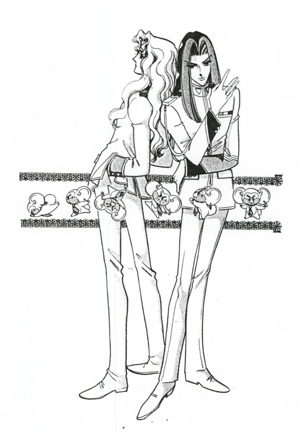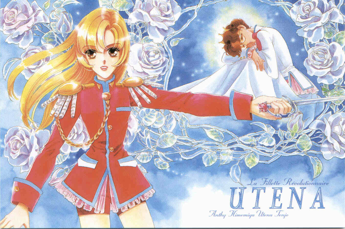 You've stumbled upon the Manga Image gallery! This is meant to be a sampling of the wonderful artwork of Chiho Saito, the talented artist who created the Utena manga. These images were scanned by a variety of our friend's scanners and the scanners at school (We didn't get our own scanner until this past winter), so they all look a little different. Also, a few are not stored locally, because Angelfire only gives us 5MB of storage to work with. Finally, these are very large, "raw" image files. If you want to use them, go ahead - but you will have to do some heavy editing!