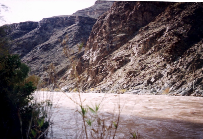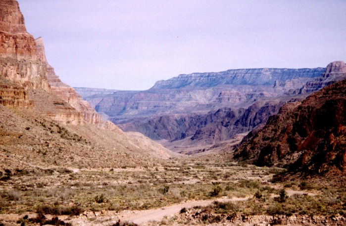 Side canyon following a fault. Downthrow is to the left. Pre-Cambrian rocks are