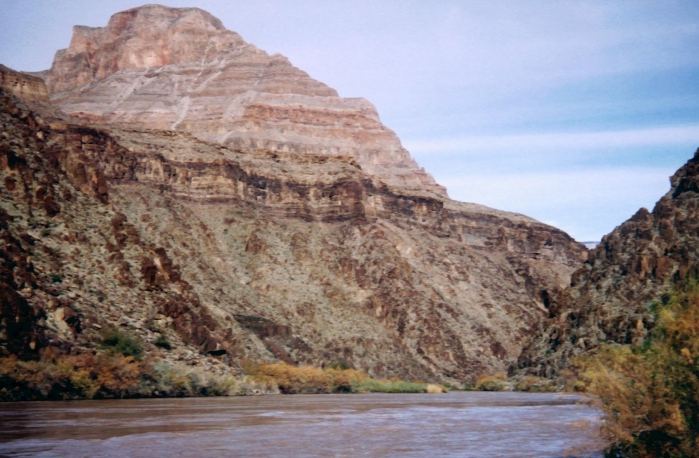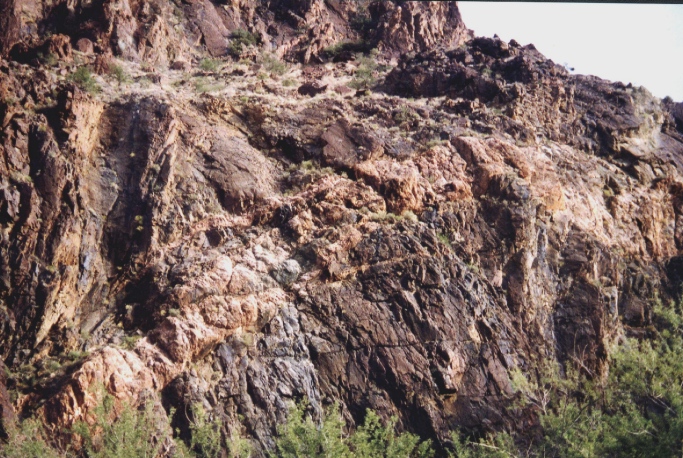 These are the dark rocks of the inner gorge lying below the horizontal Palaeozoic strata. The rocks are highly deformed and metamorphosed and consist of schists and granite. Their junction with the horizontal Palaeozoic strata provides a striking example of an unconformity.