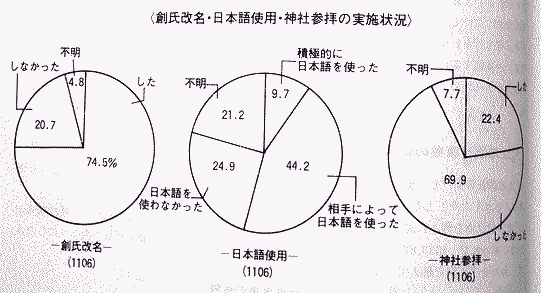 | 在日コリアン1世の創氏改名・日本語使用・神社参拝の実施状況。創氏改名をしたというのは、日本人風の氏を選んだ「設定創氏」と思われる。 |