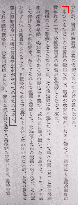 もつともひどいのは労務の徴用である。戦争が次第に苛烈になるにしたがつて、朝鮮にも志願兵制度しかれる一方、労務徴用者の割り当てが相当厳しくなつて来た。納得の上で応募させてゐたのでは、その予定数に仲々達しない。そこで郡とか面(村)とかの労務係が深夜や早暁、突如男手のある家の寝込みを襲ひ、或ひは田畑で働いてゐる最中に、トラックを廻して何げなくそれに乗せ、かくてそれらで集団を編成して、北海道や九州の炭鉱へ送り込み、その責を果たすといふ乱暴なことをした。但(ただ)総督がそれまで強行せよと命じたわけではないが、上司の鼻息を窺ふ朝鮮出身の末端の官吏や公吏がやつてのけたのである。 |