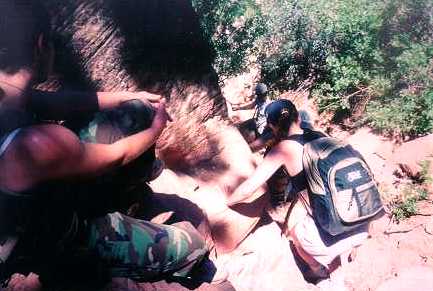 Well as it turns out Eric was ok and he was still nice enough to be of much service to all of us as we headed down into the canyon. As a matter of fact it would have been really nice if we could have...maybe...had the rope for this part. You know, loop it around a tree, hold on to both ends and sort of arm over arm rapell from one standing point to another. But noooooooo Joe had it in his backpack...and we had NO idea where he was at this point.