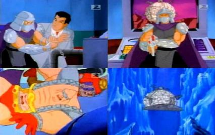 TMNT REVIEW HQ COMMENTS: An episode with some importance and historical value, where the location of the Technodrome changes – which doesn’t happen much – from Dimension X to the North Pole on Earth. An appealing story where we find out Shredder has a brother, however like the opposite of him, he fights for good as a police lieutenant. Do they reunite and make up? Do they hell. Shredder is unrepentant about his bad deeds so the brotherly rift is never mended. Dodgy at the start but strengthens afterwards, with a few very good moments. One minor question I hold to this episode, when Bebop and Rocksteady are in a shoot-out with the cops with their laser guns, why do the 20h century cops have them as well? Oh that’s right (it’s a rhetorical question), gun bullets were deemed too violent or too graphic for the audience.