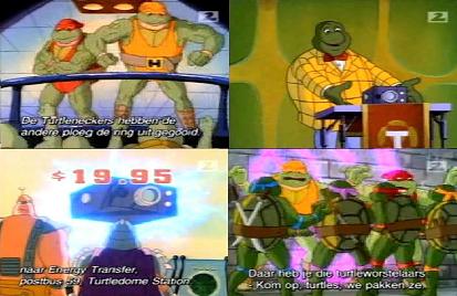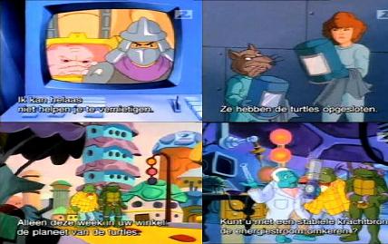 Dimension X is experiencing the same problems. Krang then sees this as another oppurtunity to power up the Technodrome and get back to Earth. He see a turtle named Rupert, selling and promoting a Personal Energy Projector on TV. When Shredder tries to steal the Projector, Rupert and the wrestling tag-team chase him back to Dimension X. However, Krang has a use for the Turtlenecker Brothers, to capture the turtles, and go through the dimensional portal to the NY sewers and do exactly that! April and Splinter, the ones remaining mange to get through the portal to Dimension X just in time before it closes.