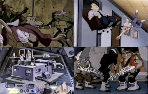 Bebop goes along with the Foot soldiers to "shoot and loot". Rocksteady wants to have a little playtime with the helpless turtles. However, the turtles get the best of him and nab his gravity boots. Michaelangelo is now free to move. He steals 2 more pairs. Donatello realises that the device does not affect the birds and concludes they are above the force of this mega-gravity. His idea is to use the Turtle Blimp. Michaelangelo has four boots for the 3 other turtles, which would 1 turtle wouldn't get any. To swerve round this problem, the 3 turtles share the boots between them, having to walk at the same time.