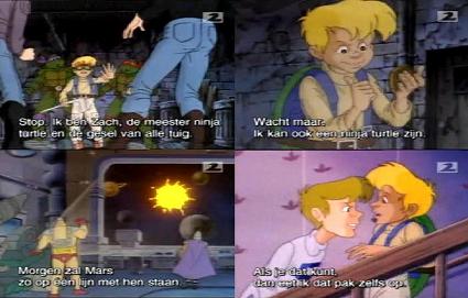 TMNT REVIEW HQ COMMENTS: The fifth turtle, no, it's not Venus De Milo (female turtle for another TMNT series), but according to this cartoon it's Zack, the human kid, who is a big fan of the TMNT. It's a quite a good episode. Action from th very beginning, as the turtles take out crooks but then Zack intervenes. How did Zack find out about the turtles? It was never explained but it's most likely he saw them on the TV news reports