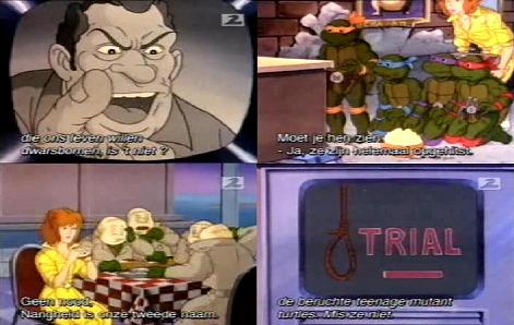BRIEF STORYLINE: 3 of the turtles are content in their lair watching professional wrestling on TV until Michaelangelo switches it over to “ON TRIAL”, hosted by Clayton Kellerman, an egomaniac with his own talkshow who suggests the turtles are a danger to the public lurking in the sewers. The turtles are horrified by this and can’t understand why people would hate them, as they fight for good. April gets her hands on human masks from her make-up department so the turtles can walk safely in public to avoid being discriminated.