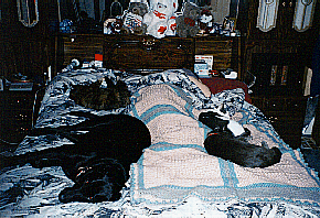 Here is a picture of most of my family. Starting from the bottom left is the largest of our children, Midnight. We like to call him Goober because he's such a knuckle head sometimes. He is an English Black Lab. Next in the top left is Mitten. So named because one of her front paws has light coloring on it. We have another cat not in the picture from the same litter that we call Tiny. Of course she's not very tiny anymore. In fact she's fat. The next child is the white and grey pile of fur we call Baby. He was a neglected cat that we took in. In the bottom right corner is Smokey. He is a really neat and very friendly cat. He was a stray from Pittsburgh. And last but not least my favorite pet of all, my wife. She's that lump in the middle of the bed between all the children.