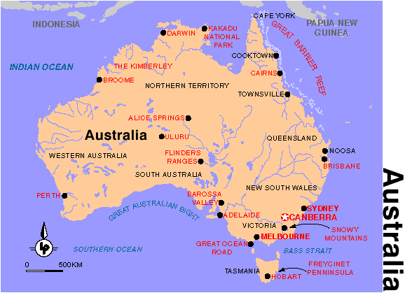 Australia occupies one of the oldest landmasses and the flattest of all continents, the highest point, Mt Kosciuszko being 2228m (7,310 feet) in the Australian Alps between NSW and Victoria. The fertile coastal strip hides a dry and inhospitable centre, the Outback - a photographer's delight with its colours of flaming red, rich brown, pale yellow and orange interspersed by the bluish-green of low scrub and the linen-white trunks of ghost gum trees. This seemingly endless land is broken by saltlakes, starkly beautiful mountains like the MacDonnell Ranges near Alice Springs, Flinders Ranges in South Australia and the mysterious rock formations of Ayers Rock/Uluru, Mt Olga/Kata Tjuta, and Mt Augustus. The longest river, originating in Queensland, is the Darling measuring 2736km.
