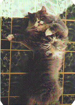 I sleep alot, but when up, I'm extremely playful. I have many dogs to play with in the house. One barks at me everytime I sit on the window in the vaulted ceiling that overlooks the living room from the bedroom. Maggie barks at me because I've already used up 2 of my 9 lives by jumping down from this window! She's informs my Mum that I'm getting ready to jump. She's just jealous she's not a cat!