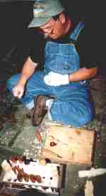 Rick hard at work carving on the porch of the cabin. "Wood chips everywhere"