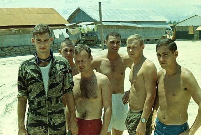 Picture in hooch area at Marble Mountain. From left to right: Doug "Windy" Page, Tony Costa, Tim Ashbaugh, Cal Hutchinson, Steve Waltrip and Charlie Plunkett.