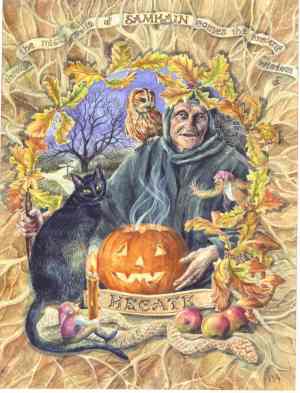 Now for a bit of history, we must go back to old Irish tradition. The Celts had 3 harvests: Aug 1, or Lammas, was the first harvest, when the first fruits of the season were offered to the Gods in thanks. The Fall Equinox was the "true harvest". This was when the bulk of crops would be brought in. Samhain was the final harvest of the year. Anything left on the vines or in fields after this date was considered blasted by the fairies and unfit for human consumption. Samhain was one of the sacred "Fire Festivals" of the druids. All the hearth fires in Ireland were extinguished, and then re-lit from the central fire of the Druids at Tlachtga, 12 miles from the royal hill of Tara. The extinguishing of the fires symbolized the "dark half" of the year, and the re-kindling from the Druidic fires was symbolic of returning life. It was believed that departed loved ones could return to the land of the living on Samhain to celebrate with their families. The great burial mounds of Ireland, "sidhe (shee) mounds", translated as "faery mounds", were opened up and strewn with lighted torches along their walls, so the beloved dead could find their way home safely. Extra places were set at the table and food provided for any of the years deceased that wished to partake. This holiday was said to be the very best for divination. At no other holiday was it as likely to succeed. The custom of dressing in costume and going from house to house is of Celtic origin and was actively indulged in by adults as well as children. Also, the 'treat' which was required was often one of spirits or alcohol. Symbolism of Samhain: The Third Harvest, the Dark Mysteries, Rebirth through Death. Symbolized by jack-o'-lanterns, the balefire, besoms, masks, and cauldrons. Herbs of Samhain: Mugwort, Allspice, Broom, Catnip, Deadly Nightshade, Mandrake, Oak leaves, Sage and Straw. Foods of Samhain: Corn, Beets, Turnips, Gingerbread, Apples, Spices, Pumpkin Pie, Hazelnuts, Gourds, Nuts, Mulled Wines, Beef, Pork, Poultry. Also potatoes, cabbage and onions, oatcakes. Incense of Samhain: Heliotrope, Apple, Sage, Mint, Nutmeg, Frankincense, Basil, Yarrow, Clove, and Camphor. Colors of Samhain: Black, Orange, Red, White, Silver, Gold and Yellow Gold. Stones of Samhain: All Black Stones, jet, obsidian, onyx. Spellwork for Samhain: Protection, Reflection, Renewal, Getting rid of the negative.