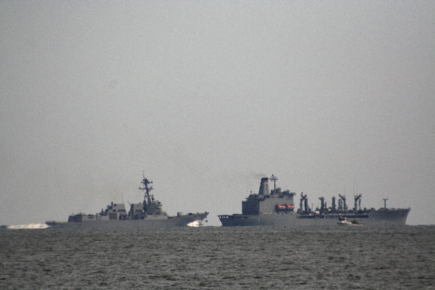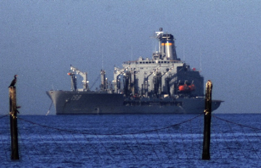 The USNS Big Horn T-AO-198 and an unidentified navy ship meet within hailing distance off Chics Beach--scoping out and discussing the bikini's beach-side, perhaps?