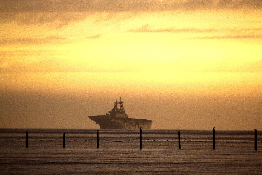 The USS LDH-1 Wasp, named for her forebearer, the USS Wasp, CV-7, of WWII fame, rides the low swells at sunset just inside of the Eastern Shore's Fisherman Island.