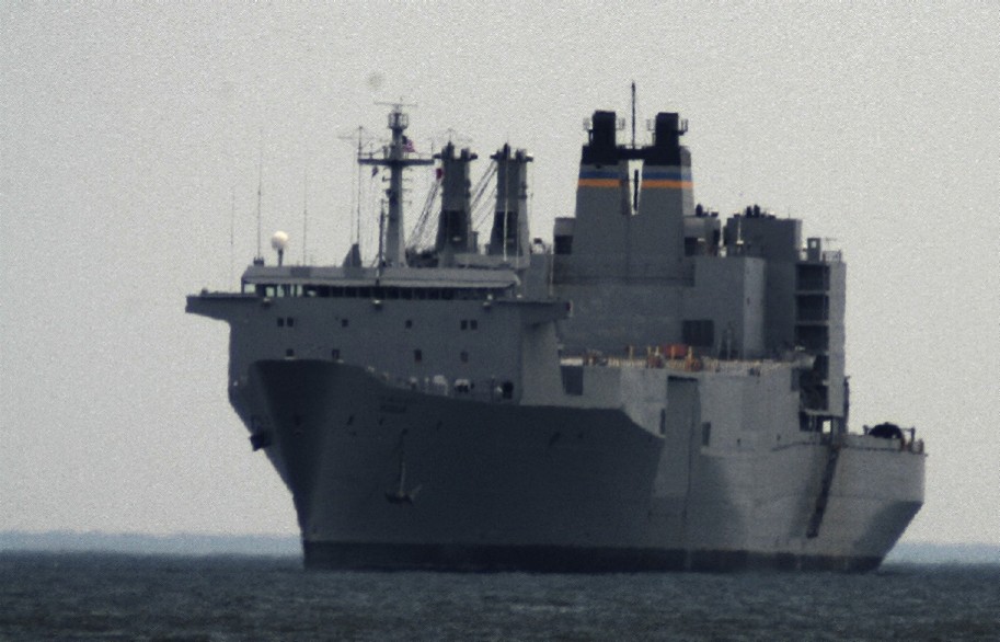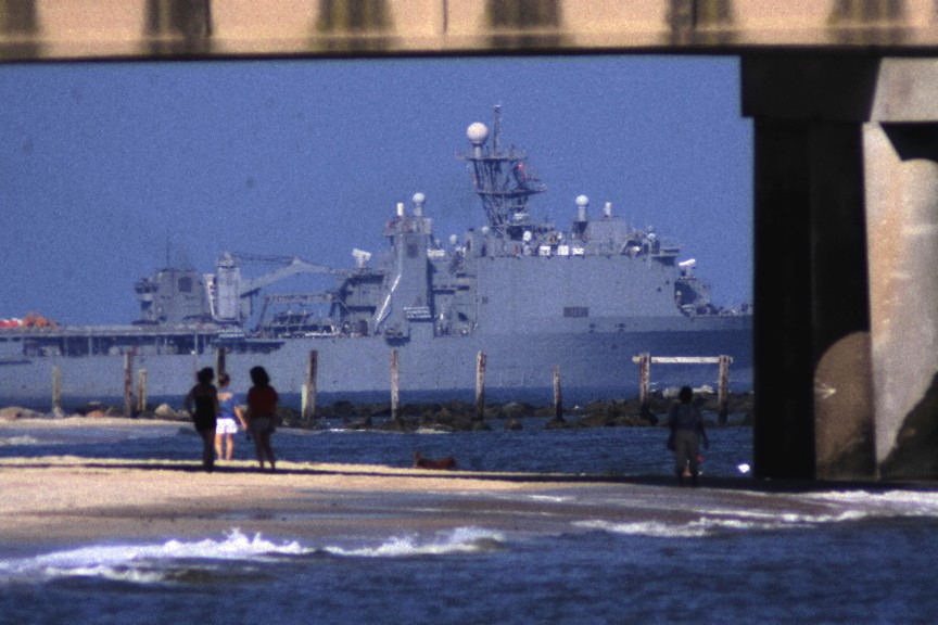 The USS GUNSTON HALL (LSD 44) passing through the channel close by the Chesapeake Bay Bridge Tunnel, heading for open sea and ???